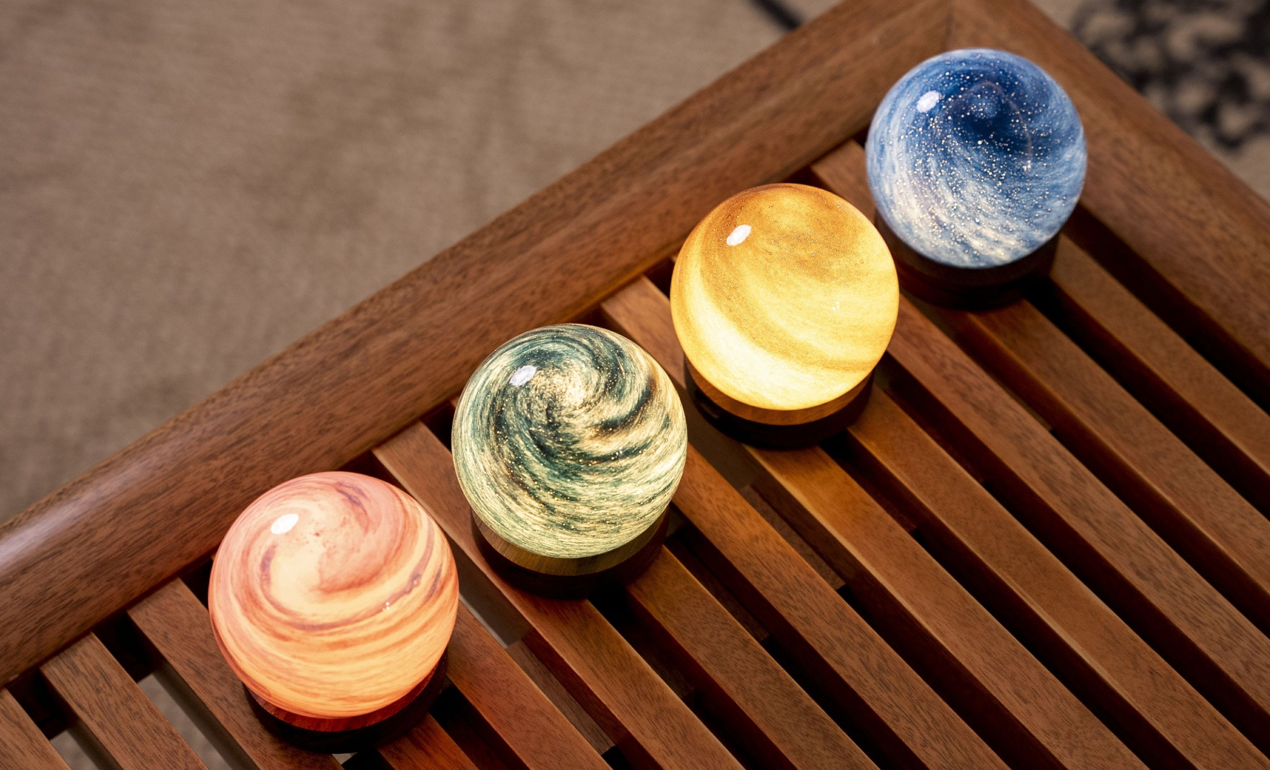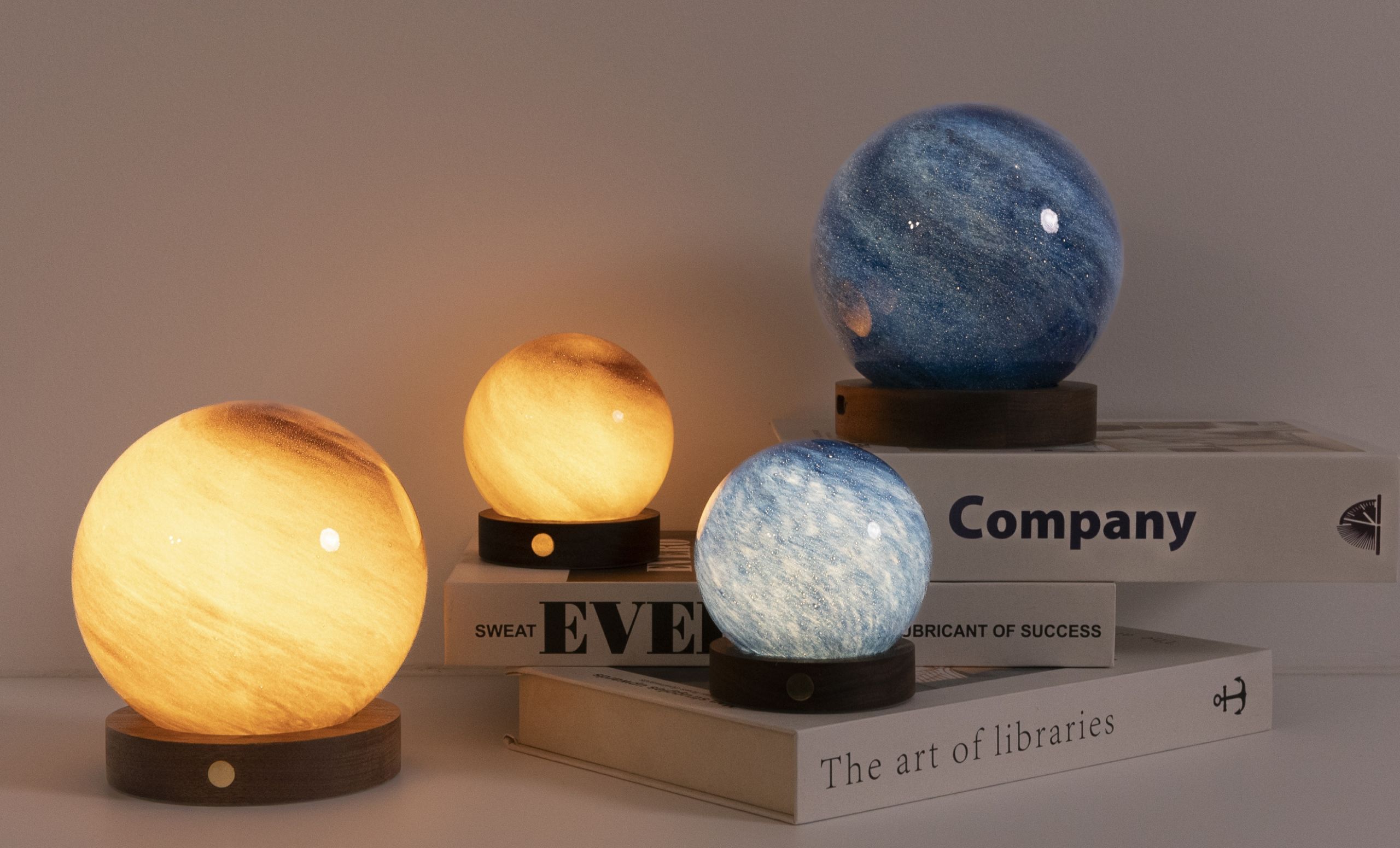 The lamp’s eco-friendly base, crafted from FSC-certified American walnut wood, complements its celestial design. It would fit right in with the dark woods of a library or even a bedside table. The hand-blown glass globe showcases artisanal craftsmanship, ensuring every piece is as unique as the stars themselves. A USB-C rechargeable port provides convenience, while a protective mat ensures your furniture remains scratch-free.