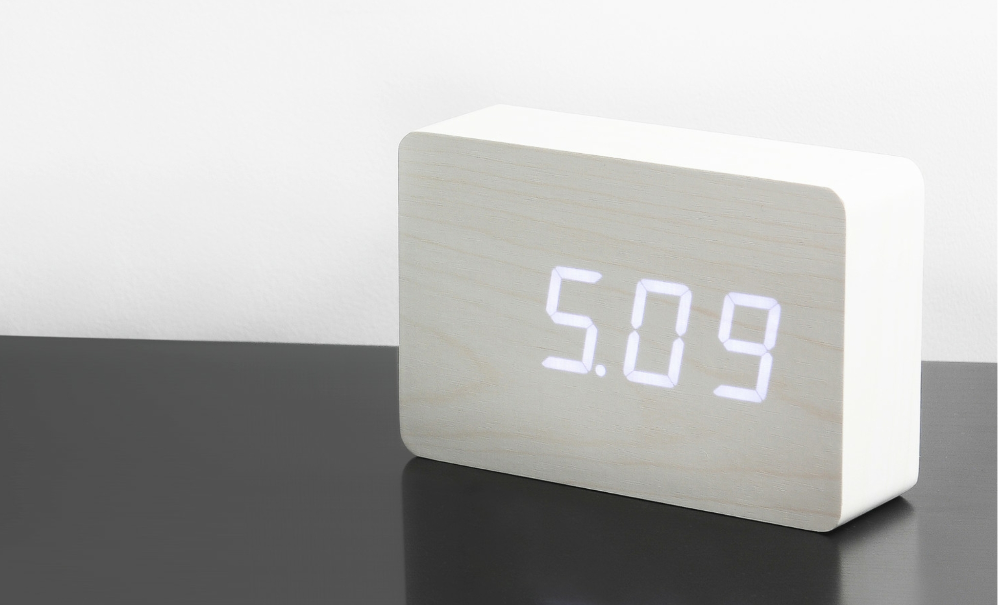 Just click your fingers, clap your hands or gently tap your bedside table and the time, date and temperature will alternately appear for you in green LED colour. It automatically switches off when the room is quiet, lighting up again when the alarm goes off or as a response to noise or motion.The numbers seem to float on the lovely wooden block, but that’s just some of the magic of this cuboid with a conscience.